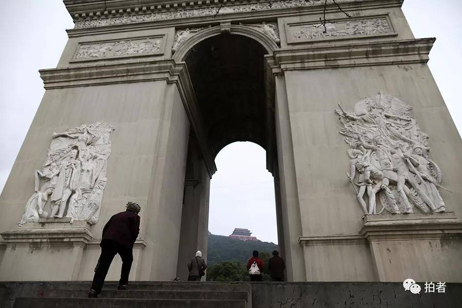 华西村世界公园,一群游客走上仿建的凯旋门参观。