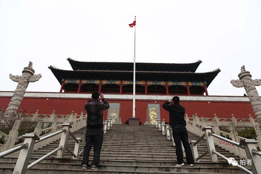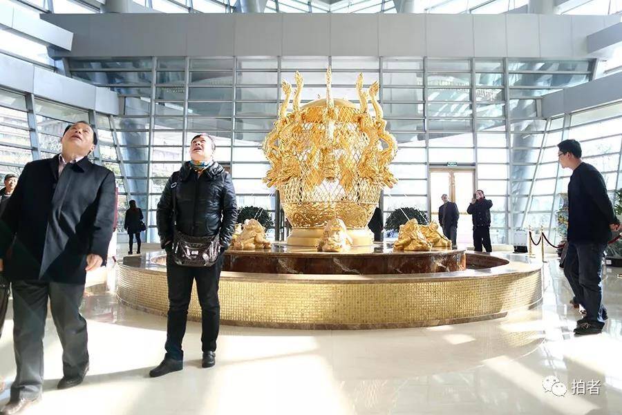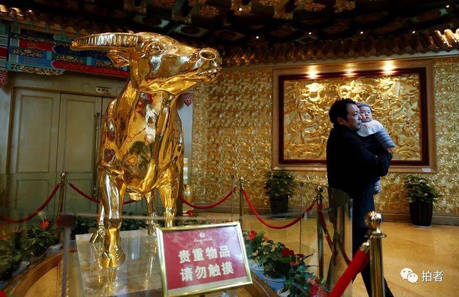 龙希国际大酒店60层,游客在一吨重的纯金牛旁留影。这头金牛耗资三亿,号称“天下第一金牛”。