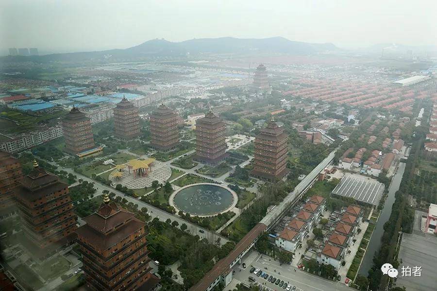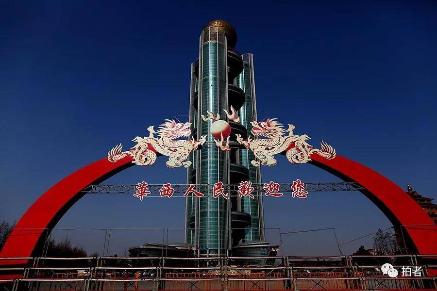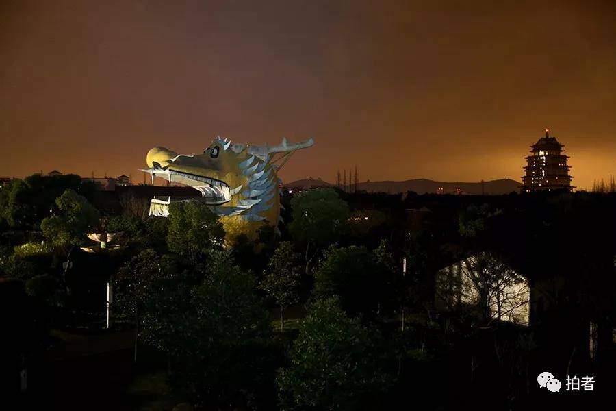 华西村幸福园,巨大的龙头突显在村子上空,身后是华西村的老地标建筑金塔。