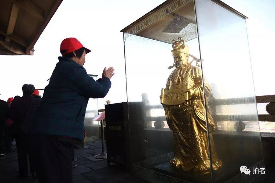 7级塔形设计的华西金塔顶有三尊金光闪闪的塑像,分别代表“福禄寿”,每座塑像都配有相应的说明,寿星像上面写着:“今供奉老子神像,宏扬教育,抓好思想教育,使人们都成为有益于社会的人。”图为华西金塔,一位游客在拜财神。
