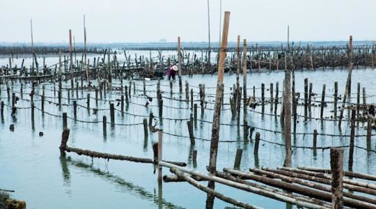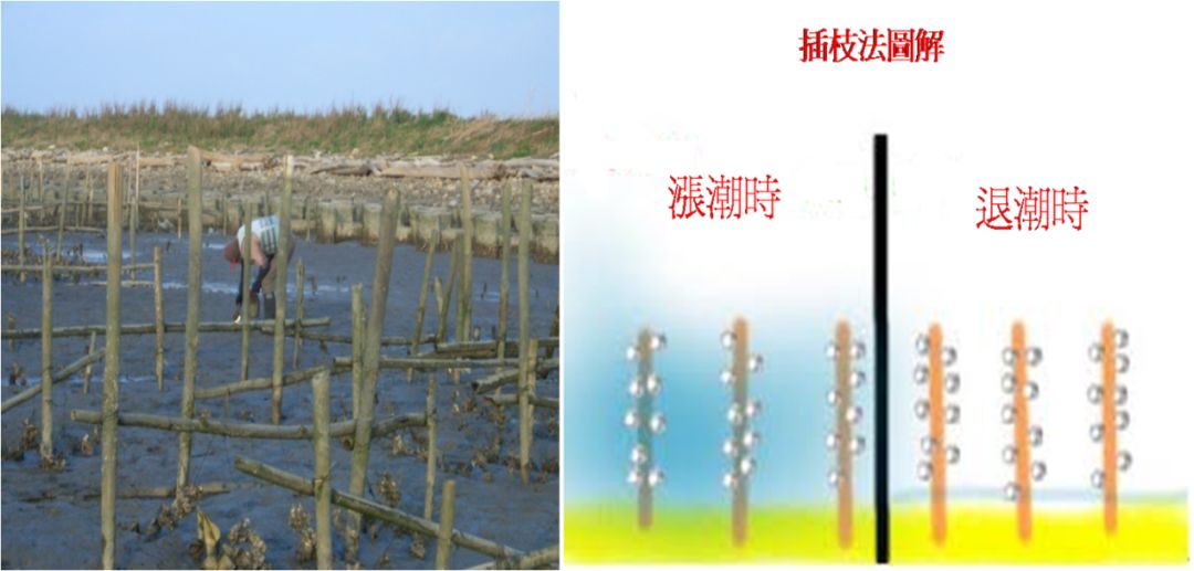 上图:王功蚵园,采插枝式的方式来养殖蚵仔