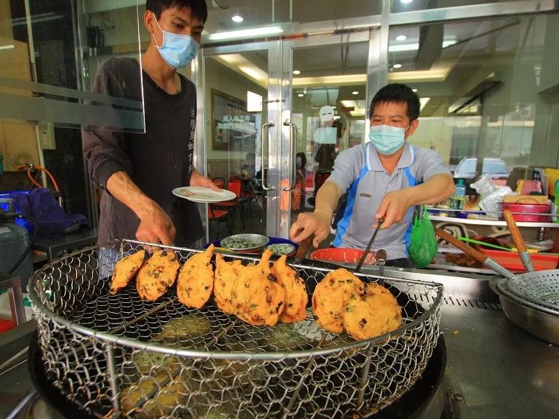 在美食街上,卖得最多也最好吃的美食,就是蚵嗲。金黄的外衣,包裹着满满的蚵仔和青菜,搭配当地的蒜蓉酱油,一口咬下去,宛如在潮间带上与蚵仔嬉戏,好吃到令人发指啊!