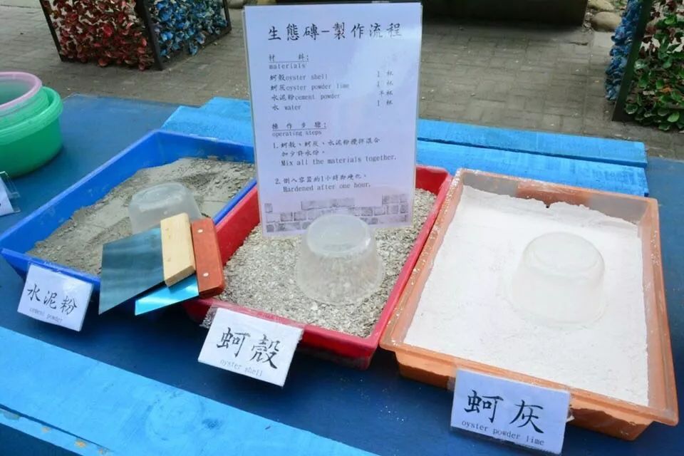 他们用压路机碾碎蚵壳,割断尼龙绳,以方便回收,而蚵壳碎片也不会被丢弃,在捡拾完垃圾之后,王功人们将蚵壳碎片做成“生态砖”,用以搭建王功特色地景艺术。
