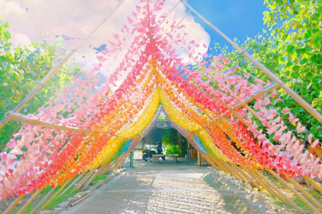 近年来旅游有了新模式,游客们喜欢到一些鲜为人知的美丽景点“拍照打卡”。王功为了迎合这种趋势,让更多的游客来“拍照打卡”,了解王功的文化,他们耍了个“小心机”——利用蚵艺在故事馆门前搭建了一个漂亮的“彩虹隧道”。